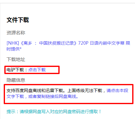 由于资源过于敏感,百度网盘禁止分享,唯电影提供的是电驴下载,下载页面两个蓝色的地方都可以下载,如果上面的链接无法下载,请使用下面的链接。站长使用迅雷U享版配合会员可以达到40M/S的下载速度。建议大家使用迅雷U享版(需会员)、迅雷9、迅雷X进行下载。已更新百度网盘下载连接,由于视频无法分享,上传的是压缩包,请自行解压,RAR压缩包添加有恢复记录,如果遇到解压校验失败请自行恢复后再进行解压。